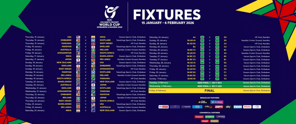 துபாயில் நடைபெற்ற அறிவிப்பின் போது, அடுத்த ஆண்டு ஜனவரி–பிப்ரவரி மாதங்களில் ஜிம்பாப்வே மற்றும் நமீபியாவில் நடைபெற உள்ள 16-வது ஐசிசி ஜூனியர் (U19) ஆண்கள் உலகக் கோப்பை கிரிக்கெட் தொடருக்கான முழு போட்டி அட்டவணையை ஐசிசி வெளியிட்டது. மொத்தம் 16 அணிகள் பங்கேற்கும் இந்த தொடரில், அனைத்து அணிகளும் 4 பிரிவுகளாக பிரிக்கப்பட்டுள்ளன. லீக் கட்டத்தில், ஒவ்வொரு அணி தங்களது பிரிவில் உள்ள மற்ற அணிகளுடன் தலா ஒருமுறை மோதும். லீக் சுற்று முடிவில், ஒவ்வொரு பிரிவிலும் முதல் மூன்று அணிகள் சூப்பர்-6 கட்டிற்கு முன்னேறுகின்றன.